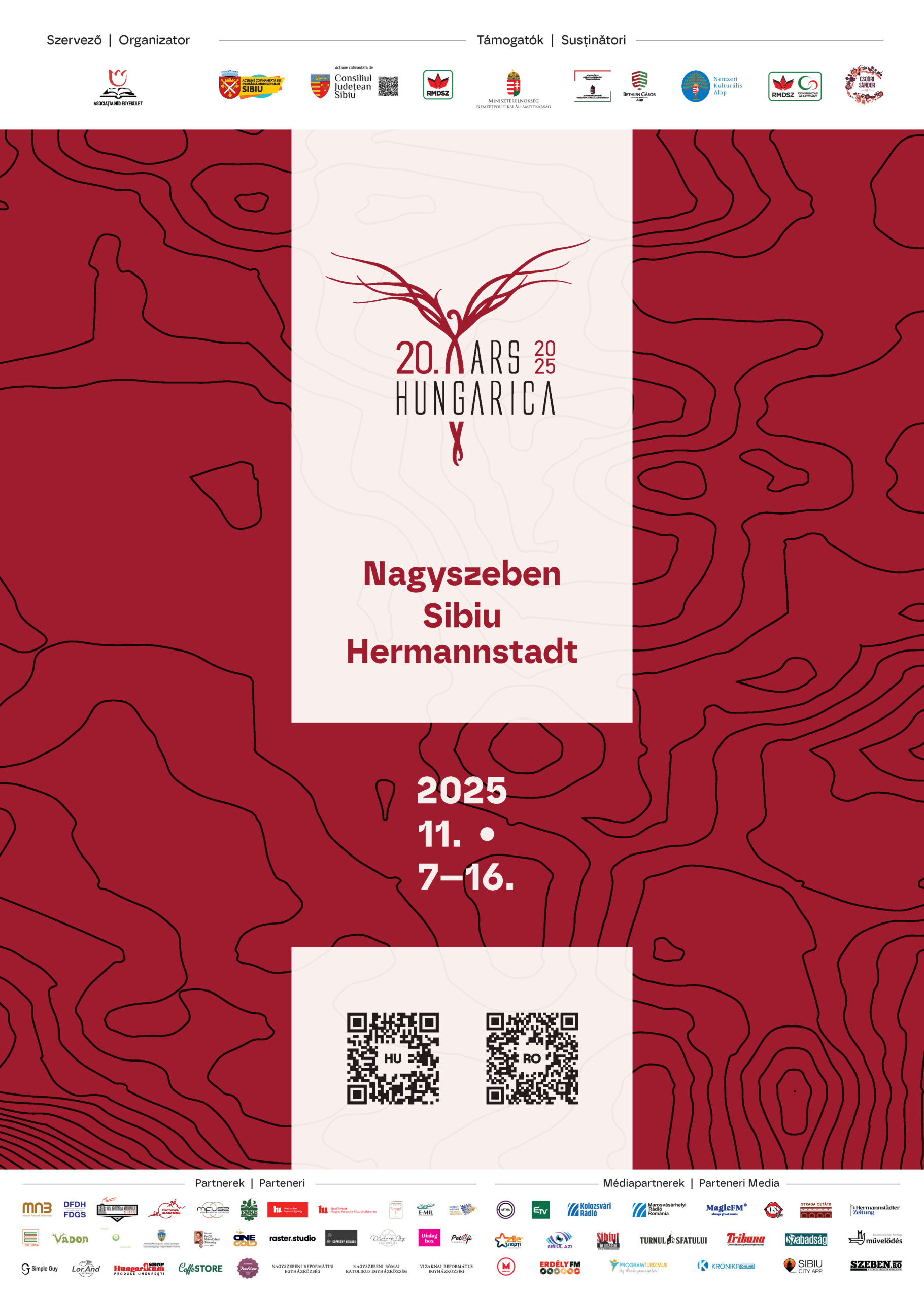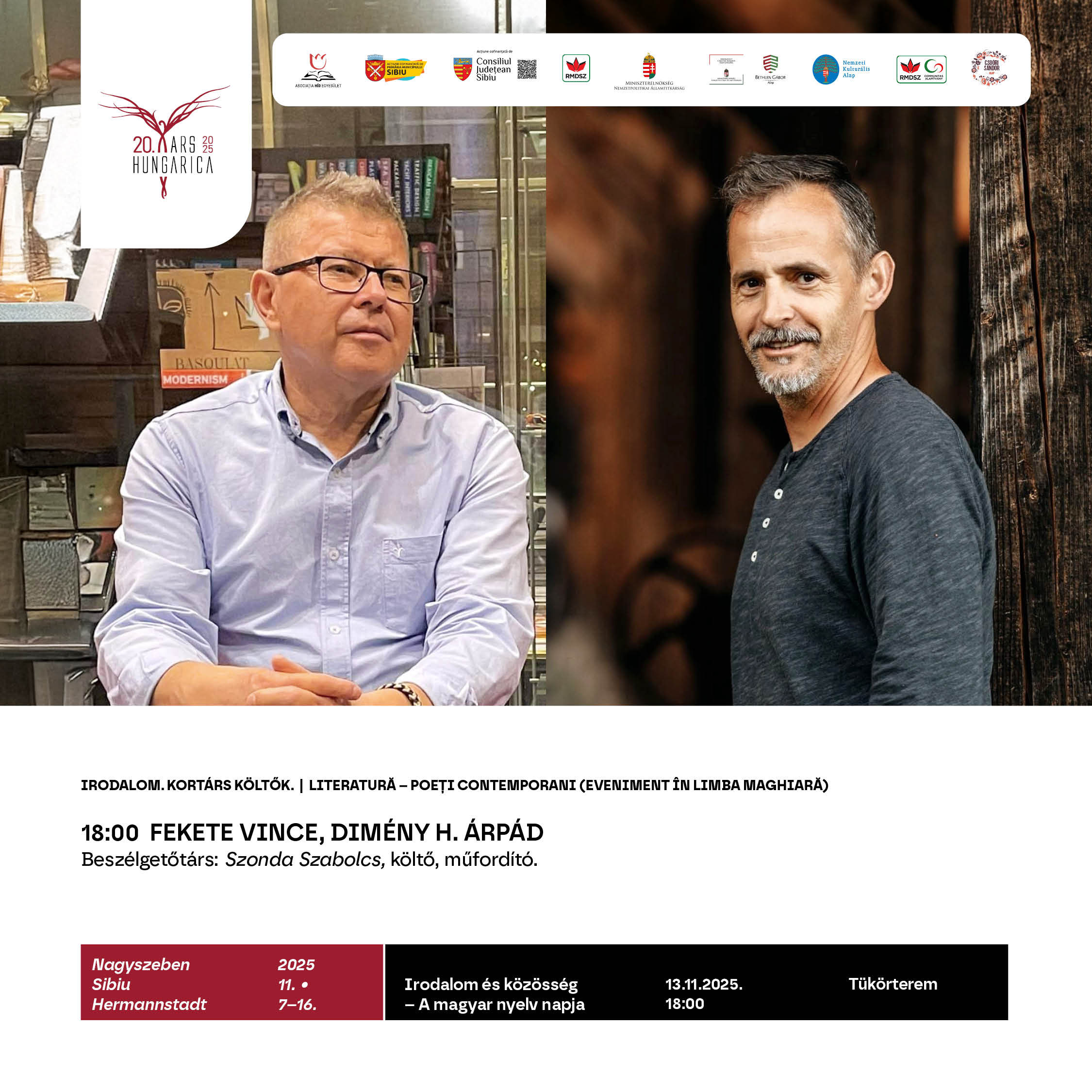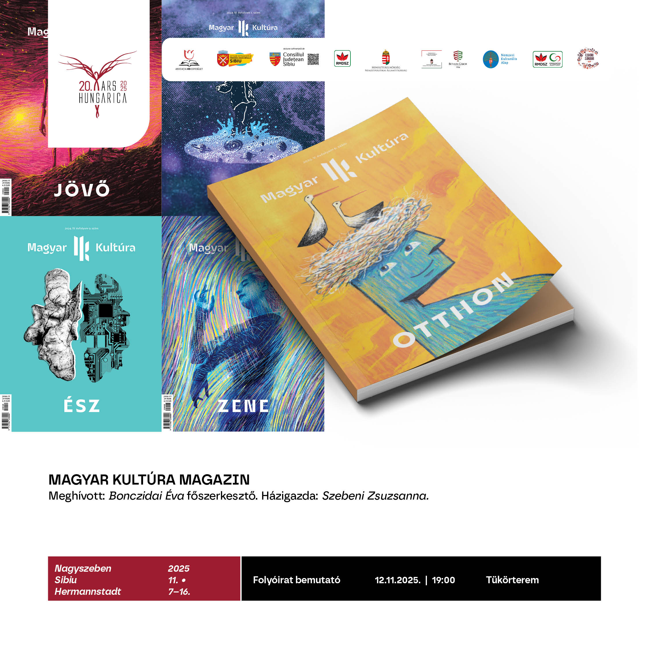 Támogatók: Nagyszeben Polgármesteri Hivatala, Szeben Megye Tanácsa. Magyarország Miniszterelnöksége – Nemzetpolitikai Államtitkárság, Bethlen Gábor Alapkezelő Zrt. Nemzeti Együttműködési Alap, Nemzeti Kulturális Alap, RMDSZ és Communitas Alapítvány. Csoóri Sándor Program, Petőfi Sándor Program.