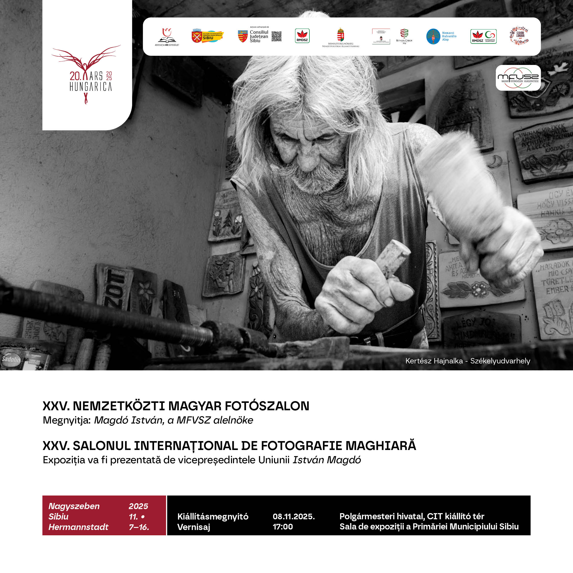 17:00 órakor a Nagyszebeni Polgármesteri Hivatal kiállítóterében nyílik meg a XXV. Nemzetközi Magyar Fotószalon kiállítása, amely a Magyar Fotóművészek Világszövetsége 2025-ös díjazott képeit mutatja be. A tárlat a fotóművészet világába enged betekintést, bemutatva a különböző látásmódokat, témákat és technikákat, amelyek a kortárs magyar fotográfiát jellemzik. A kiállítást Magdó István, a Magyar Fotóművészek Világszövetségének alelnöke, valamint Louis Guermond, nagyszebeni fotográfus nyitják meg.