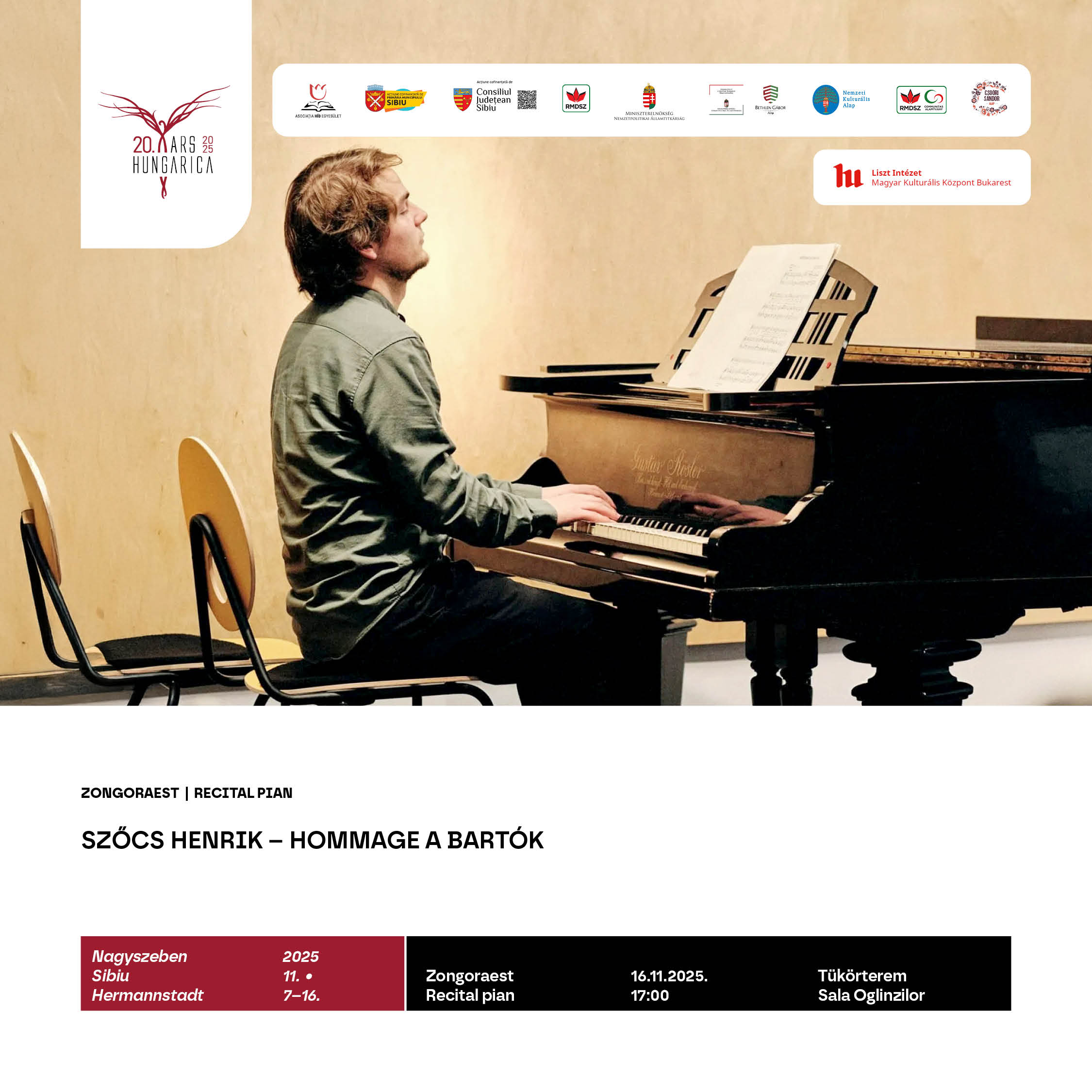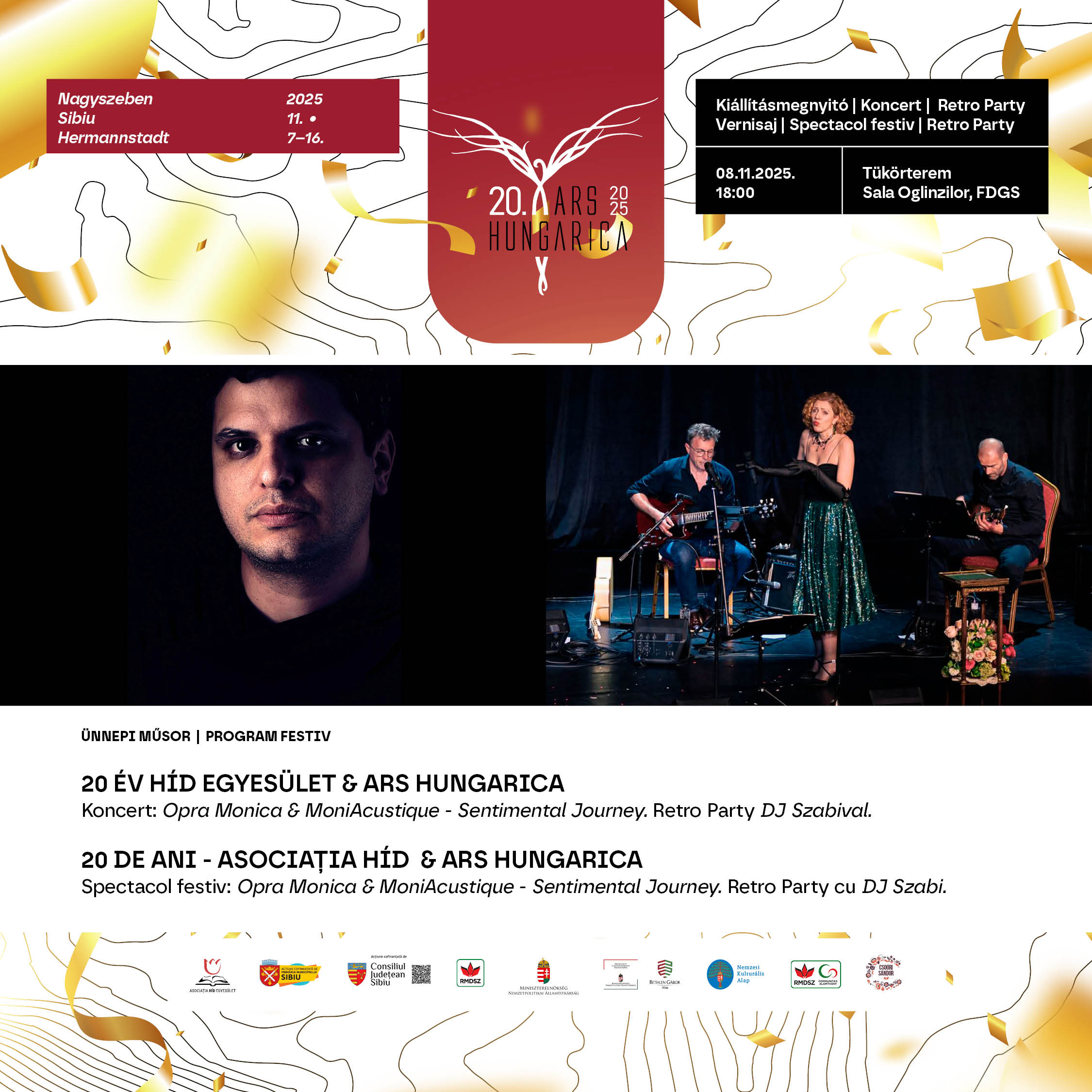 19 órakor a Nagyszebeni Filharmónia Thalia Dísztermében kerül sor a 20. Ars HUNGARICA Gálaestjére, amelynek központi eseménye A lélek rejtelmei című zenés előadás: az opera- és operettirodalom legszebb áriái csendülnek fel. Az est díszvendége Molnár Levente, Liszt díjas és Érdemes művész, operaénekes. Egészségügyi okok miatt Benedekffy Katalin nem tudta vállalni az előadást. Jávorka Ildikó, felvidéki operaénekesnőt fogjuk Nagyszebenben megismerni, meghallgatni, csodálni. Alapfokú diplomáját 2017-ben szerezte meg a győri Művészeti Karon. Ezt követően 2017-ben felvételt nyert a Budapesti Liszt Ferenc Zeneművészeti Egyetem oratóriumdalének szakára, ahol 2019-ben megszerezte mesterdiplomáját, Nádor Magda növendékeként. 2021-től a Nagyváradi Partium Keresztény Egyetem énekszakos hallgatója, ahol olyan mesterek kurzusain vehetett részt, mint Molnár Levente, Lavinia Chereches, valamint Ács János, Rost Andrea. 2024-ben részt vett a nagyváradi Musicum Laude nemzetközi énekversenyen, ahol a 2. Díjat szerezhette meg, majd Budapesten a Simandy József énekversenyen a Magyar Állami Operaház Különdíjában részesült. 2025-ben Szlovákiában a Mikulás Schneider Trnavsky nemzetközi énekversenyen 3. helyezett lett, valamint a Budapesti Operettszínház különdíjasa. Zongorán kísér Sándor Szabolcs karmester, kamaraművész és zongorista, a budapesti Zeneakadémia docense, valamint a Csokonai Nemzeti Színház zenei vezetője. Az ünnepi gála hivatalos beszédekkel veszi kezdetét, majd a díszelőadás után állófogadás zárja az estét.