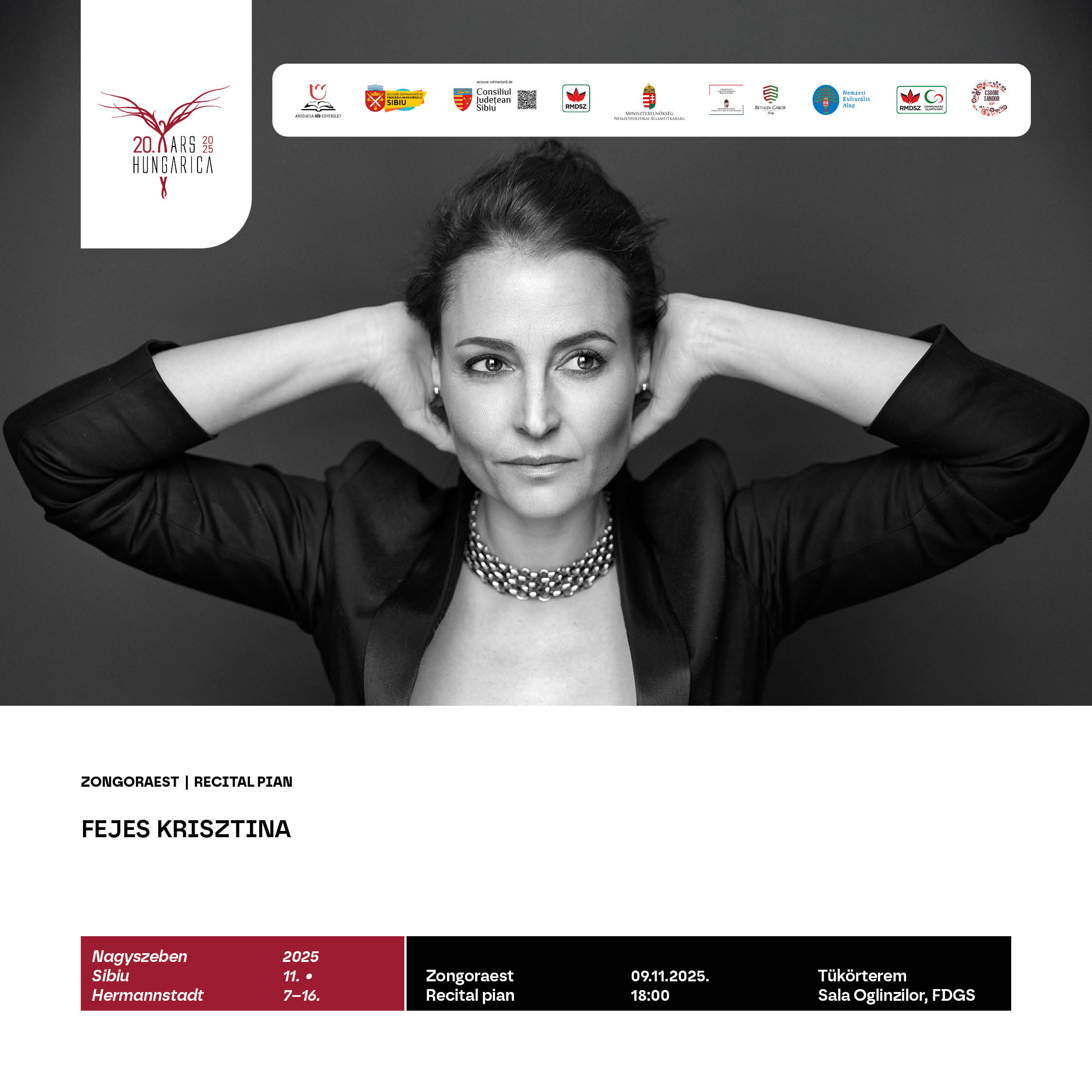 18 órakor a nagyszebeni Tükörteremben kerül sor Fejes Krisztina zongoraművész estjére, amelynek középpontjában Rózsa Miklós és Liszt Ferenc művei állnak. Fejes Krisztina előadóművészetét mély érzelmi átéltség, technikai elegancia és a zenei szerkezetek iránti különleges érzékenység jellemzi. A nagyszebeni koncert első részében Rózsa Miklós klasszikus zongoraműveiből hallhat válogatást a közönség, a második részben pedig Liszt Ferenc művei csendülnek fel.