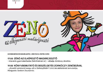 17 órakor a Zénó az elképesztő madárijesztő című gyermekelőadásra várják a legkisebbeket, amelyet Zorkóczy Zenóbia színművész ad elő. A történet középpontjában egy különös madárijesztő áll, aki hűséges szolgálat után menekülni kényszerül és a gyerekek segítségével próbálja megtalálni új életcélját. Az előadás saját szöveg mellett magyar és román költők, írók verseit és meséit is felhasználja. Az előadás 6–10 éves gyermekeknek és szüleiknek ajánlott. Az előadást követően 19 órától könyvbemutatóra és beszélgetésre kerül sor Zorkóczy Zenóbiával, a Kaszáló színésznő avagy ufó a Székelyföldön című tárcakötet kapcsán. Házigazda: Szebeni Zsuzsanna.