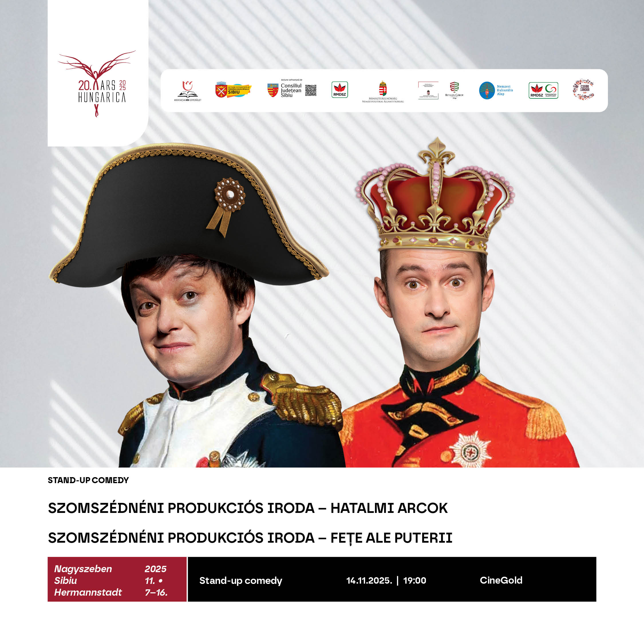 19 órakor a CineGold mozi 3-as termében (Promenada bevásárlóközpont) lép fel a Szomszédnéni Produkciós Iroda legújabb előadásával: Hatalmi Arcok címmel. Az előadás a hétköznapok abszurd küzdelmeit veszi górcső alá, a kisebb csetepatéktól a komolyabb összetűzéseken át egészen a képzeletbeli végső tusáig. Bálint Ferenc és Tóth Szabolcs, a Szomszédnéni Produkciós Iroda Karinthy-gyűrűs humoristái, garantálják a székely humorra jellemző, szórakoztató és éleslátó estét.