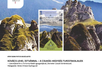 19 órától könyvbemutató és beszélgetés várja a közönséget. A Tortoma Kiadó igazgatójával, Demeter Lászlóval és Kovács Lehel István szerzővel beszélget Veres Emese Gyöngyvér A Csukás-hegység turistakalauza című kiadványról.